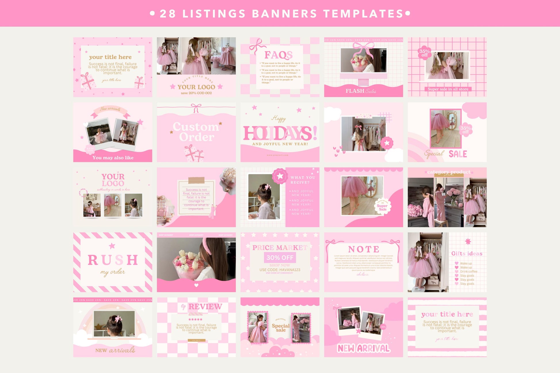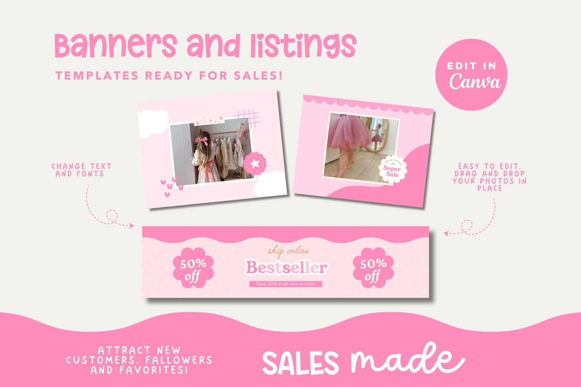 Kit de tienda Etsy rosa, lindo y divertido: incluye plantillas de banner y anuncios para Etsy. Plantillas divertidas de Canva para impulsar tu tienda online.