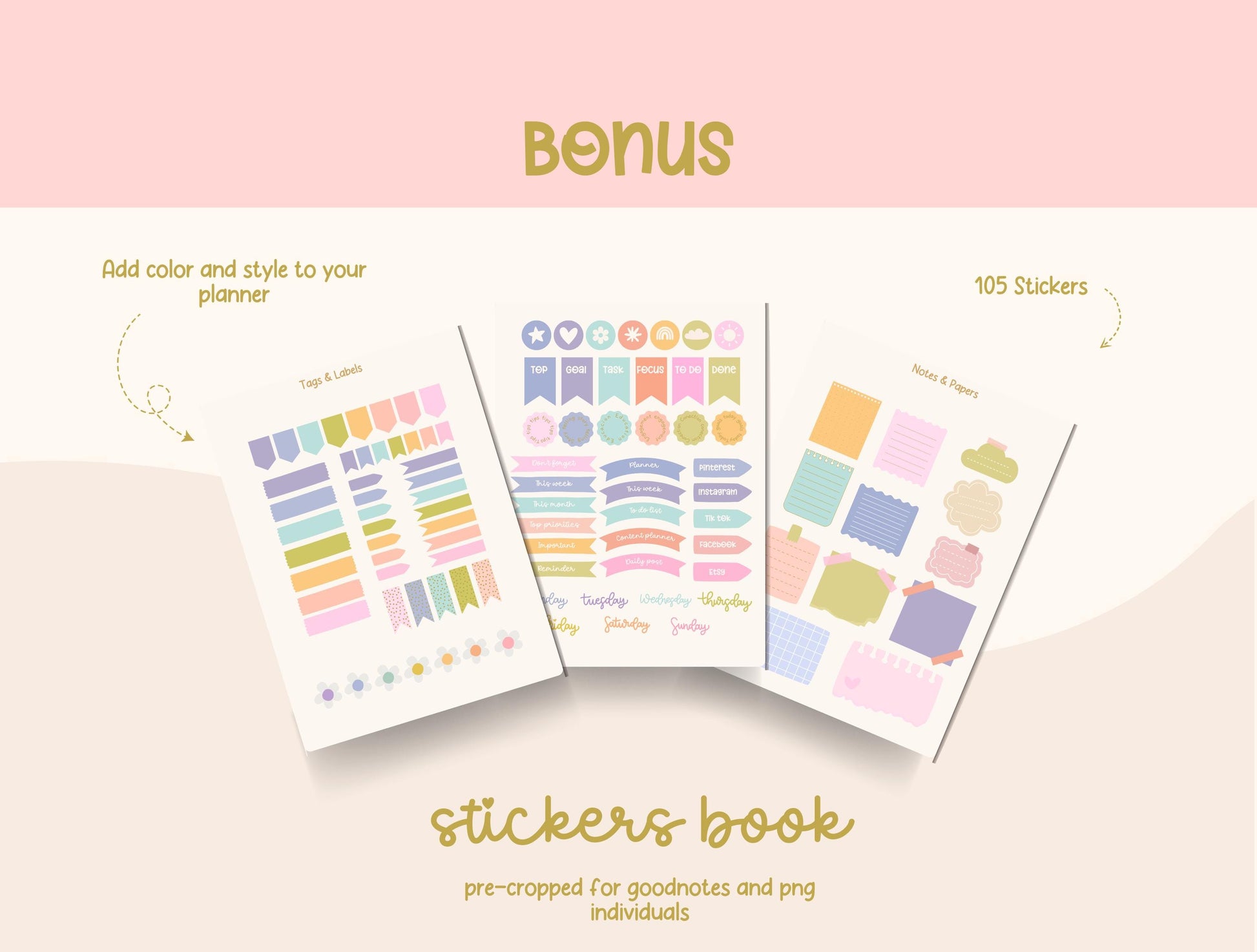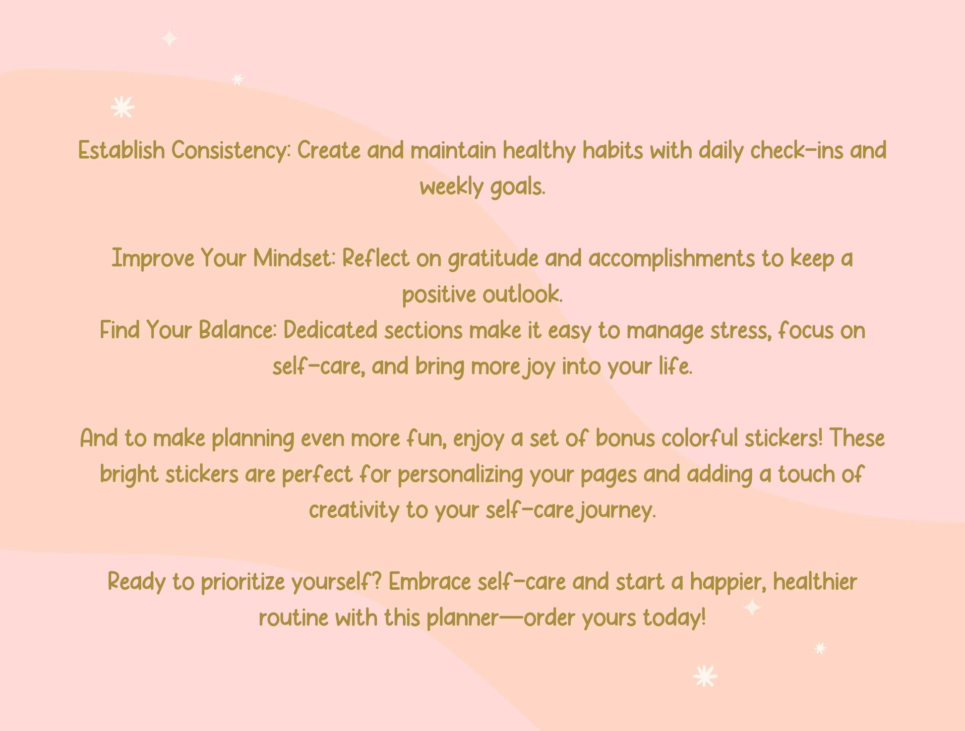 Y para que la planificación sea aún más divertida, ¡disfruta de un conjunto de pegatinas de colores adicionales! Estas pegatinas brillantes son perfectas para personalizar tus páginas y agregar un toque de creatividad a tu viaje de cuidado personal.
